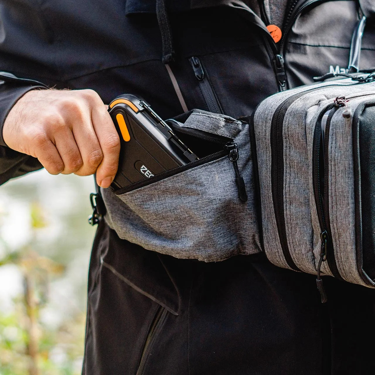 Der breite Schulterriemen ist ebenfalls mit zwei Fächern ausgestattet. Darin können das Maßband, die Vorfachtasche oder aber auch Handy, Schlüssel oder Geldbeutel und Co. verstaut werden.